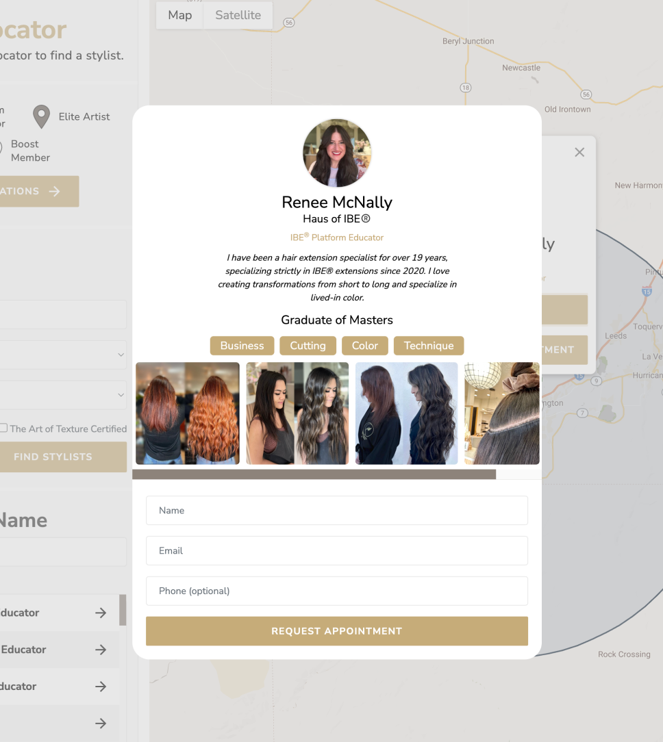 Stand out on the IBE® Stylist Locator Map with an upgraded profile and premium pin visibility, making it easier than ever for clients to discover and book with you. With IBE® driving targeted traffic to the page, you’ll gain qualified leads that help grow your business and attract the right clients to your chair.